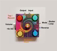 STUTTER MODE: Red is tap tempo. Hold any other button to record and instantly play a short loop. Turning the centre knob while holding a button changes the tap division for that button/loop. The divisions are 1/2/3/4/6/8/12/16. Max recording time is 6 seconds ish